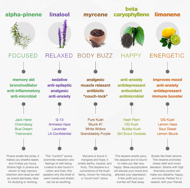 Terpenes are what give cannabis its amazingly complex taste and smell. Without terpenes, cannabis would be very bland because THC and other cannabinoids have no distinguishable odor or taste. Alpha-pinene, myrcene, limonene, and linalool may not roll off the tongue, but their sensory descriptors like piney, musky, fruity, tropical, spicy, floral, and citrusy immediately conjure up memories of familiar tastes and aromas. It’s then no surprise to learn that terpenes aren’t unique to cannabis – they can be found in everything from plants and herbs to fruits and spices. Terpenes are an important component to the overall cannabis experience, not only influencing a strain’s taste and smell but also influencing its effects on the body (summarized in the table below). The total medicinal effect of all of the components in cannabis is referred to as the “entourage effect”. This documented phenomenon is what distinguishes one strain from another, and research shows it relies heavily on the physiological effects produced by terpenes.